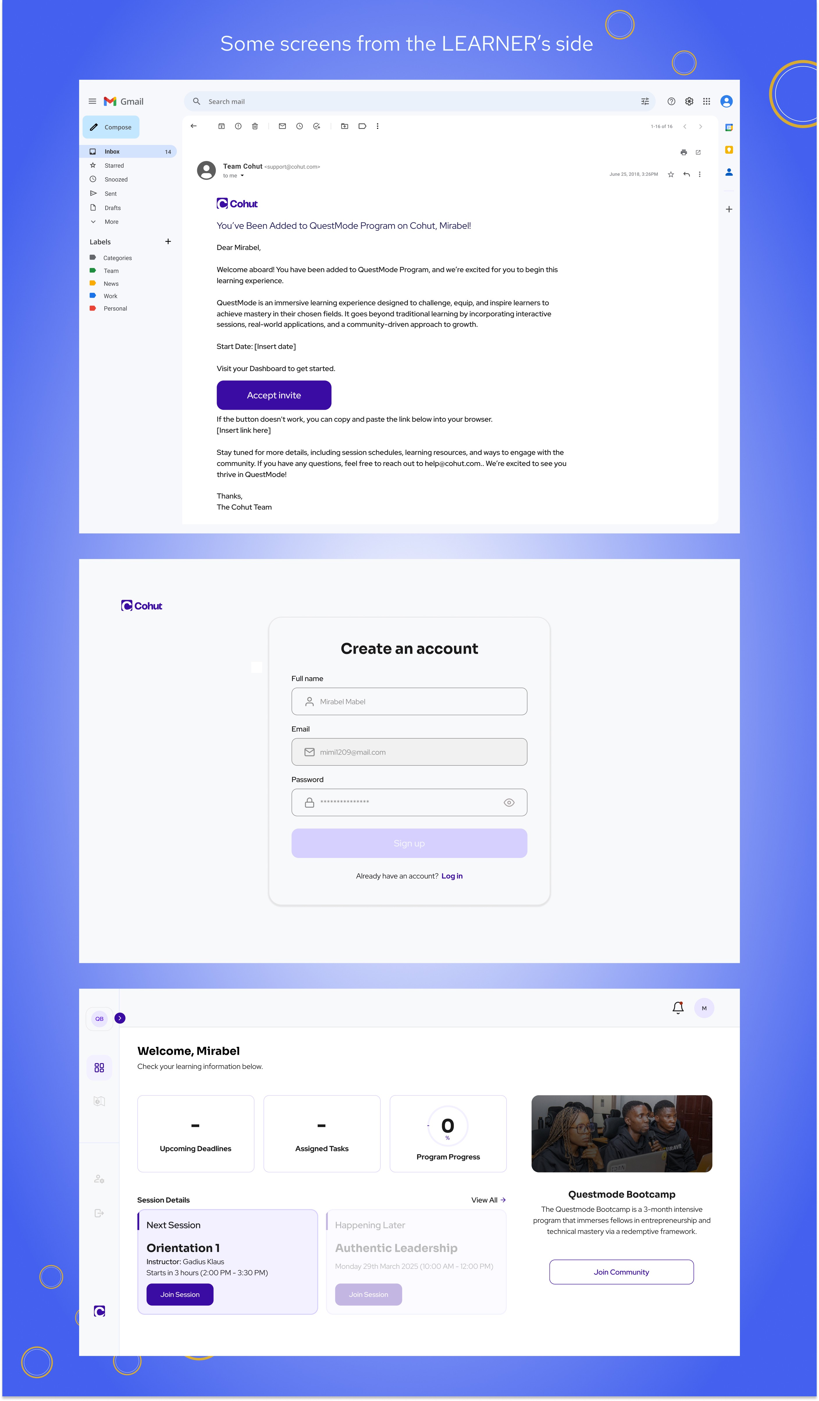 For Learners: Access was via email invite only, ensuring exclusivity. Dashboard prioritized upcoming deadline, tasks and program progress.